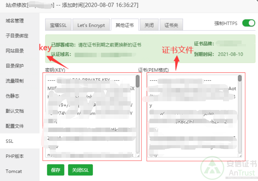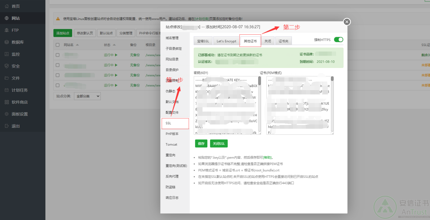 寶塔面板如何安裝SSL證書,接下來安信證書只要為大家介紹寶塔面板安裝SSL證書的圖文教程,這里的教程是Nginx環(huán)境下的。
